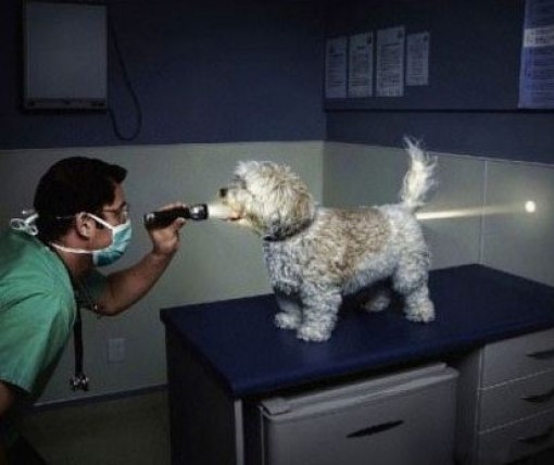 공개된 사진에는 의사로 보이는 남성이 강아지 쪽으로 손전등 플레시를 비추고 있다. 이 상황이 마치 빛이 강아지 몸통을 관통해 벽까지 도달하는 모습이다. 하지만 실제로는 빛이 강아지 옆으로 지나가며 착시 효과를 주고 있는 것.