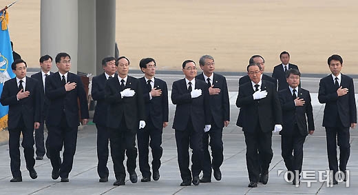 정홍원 신임 국무총리를 비롯한 국무위원들이 27일 오전 서울 동작구 국립현충원을 찾아 참배하고 있다.