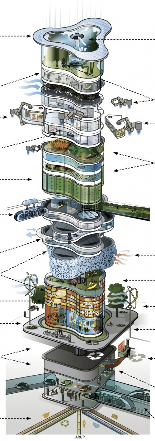 아럽이 제시한 2050년의 고층 빌딩의 특징은 '친환경'과 '스마트'다. 2050년의 고층 빌딩 상상도에 따르면 건물이 날씨는 물론 건물 내 사람 수까지 반응해 온냉방을 조절한다.