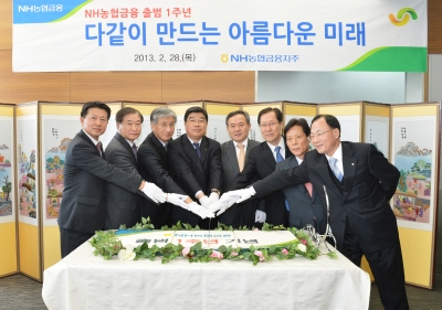 2월 28일 농협은행 본점에서 열린 NH농협금융 출범 1주년 기념식에서 신동규 회장과 자회사 대표이사들이 기념떡을 자르고 있다.