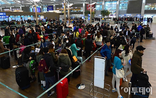사흘간의 연휴를 앞둔 28일 인천국제공항 출국장이 휴가를 즐기기 위해 수속을 밟는 여행객들로 장사진을 이루고 있다.