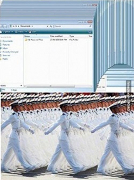 사진 속에는 컴퓨터가 멈춰버리는 '렉'에 걸려 똑같은 창들이 수백 개 띄어져 있는 화면과 군인들이 분열(열을 맞춰 행진)하고 있는 장면이 담겨 있다.