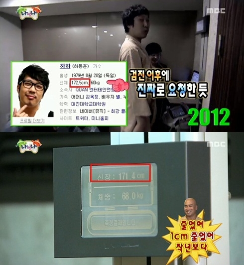 키를 재는 신체 검사에서 유독 긴장한 하하는 "172cm 넘어야 한다. 작년에 172.5cm 나왔다"고 말했다. 지난해 신체검사에서 하하는 172.5cm가 나왔고 "이거 꼭 내보내라"며 각 포털사이트에 고칠 것을 주문했다.