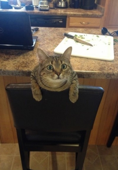 사진을 보면 고양이가 식탁 의자에 기대 눈을 크게 뜨고 억울하다는 표정을 짓고 있다. 고양이 뒤쪽을 보면 요리하던 도마위가 깨끗한 걸로 봐 고양이가 요리하던 재료를 먹은 것으로 보인다.