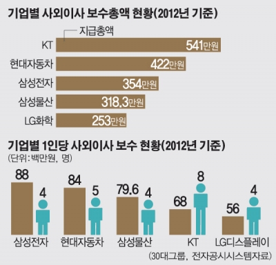 반면 사외이사들에게 가장 많은 보수 총액을 지급한 KT는 삼성전자보다 인원수가 2배로 많은 관계로 4위로 밀려났다. 2011년 사외이사들에게 각각 연간 8600만원을 지급해 1위를 기록했던 현대차는 지난해 8400만원으로 금액을 낮추며 2위를 기록했다.