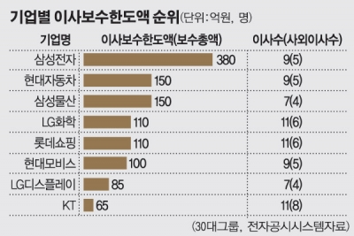 실제로 30대 기업 가운데 올해 이사보수 한도액을 최고로 많이 잡은 기업은 어디일까. 무려 400억원 가까이 되는 금액을 책정한 삼성전자다. 삼성전자는 이사보수 한도액을 지난해 대비 80억원 늘어난 380원으로 승인할 예정이다.