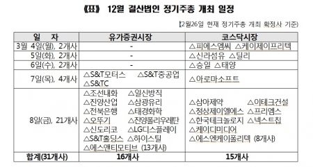 한국예탁결제원은 이번 주에 12월 결산법인 31개사가 정기주총을 개최한다고 4일 밝혔다.