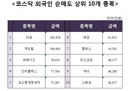 [코스닥 외국인 순매도 상위 10개 종목]