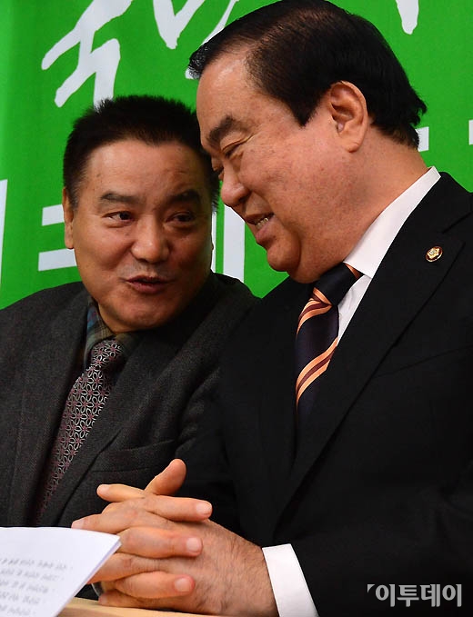 민주통합당 문희상 비대위원장이 5일 오전 서울 중구 남대문시장을 방문해 김재용 남대문시장 상인회장과 이야기를 나누고 있다.