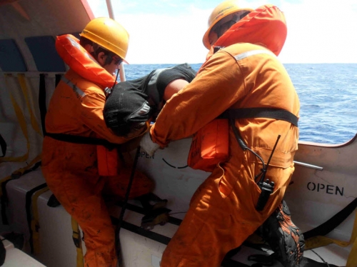 ▲현대상선 컨테이너 선박 ‘현대 유니티호’ 선원들이 지난 4일 필리핀 인근 해상에서 침몰중인 팔라완 국적 선박의 조난자 들을 구조하고 있다.