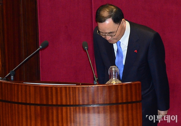 정부조직법 개정안을 두고 여야 간 협상이 난항을 겪고 있는 5일 오후 정홍원 국무총리가 국회 본회의장에서 의원들에게 인사를 하고 있다. 노진환 기자 myfixer@