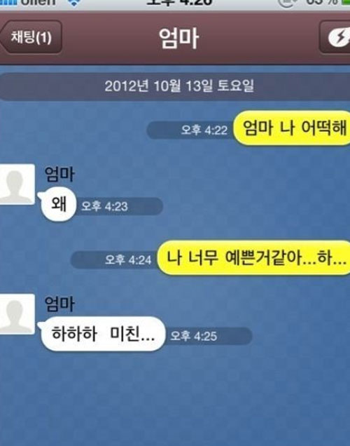 온라인상에 올라온 한 캡쳐사진은 딸이 엄마에게 카카오톡을 이용해 "엄마 나 이뻐"라고 묻자 엄마는 딸에게 "하하하 미친"이라는 메시지를 보낸다.