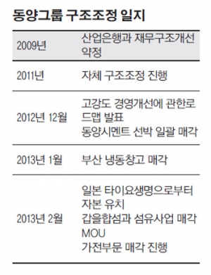 동양그룹은 가장 먼저 동양시멘트가 보유한 선박(350억원)과 ㈜동양이 보유한 부산 냉동창고(345억원) 등 비핵심 자산을 매각했다. 또 지난달 20일에는 일본 타이요생명으로부터 203억원의 자본을 유치하는 성과를 거뒀다.
