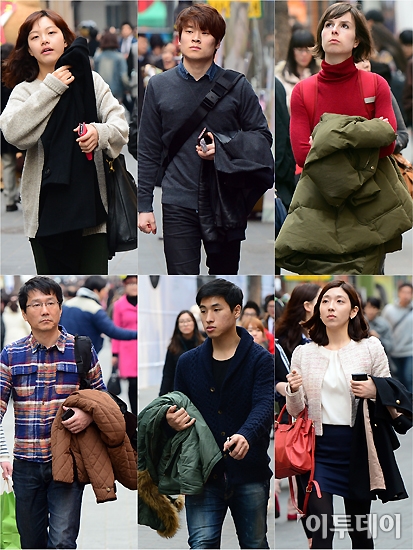 일교차가 15도 안팎을 오르내리며 변덕스러운 봄날씨를 보이고 있는 6일 오후 서울 명동 일대에서 시민들과 관광객들이 입고 나온 두꺼운 옷을 팔에 걸고 있다. 노진환 기자 myfixer@