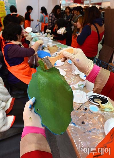 ‘2013 DIY&리폼 박람회’가 6일 오전 서울 강남구 삼성동 코엑스에서 열린 가운데 박람회를 찾은 관람객들이 DIY 소품 만들기를 하고 있다. 오는 9일까지 열리는 DIY&리폼 박람회는 작게쓰고 빌려쓰고 직접 만들어 사용하는 3대 신(新)소비문화 트랜드를 반영하여 알뜰소비문화 확산을 위해 기획되었다. 방인권기자 bink7119@