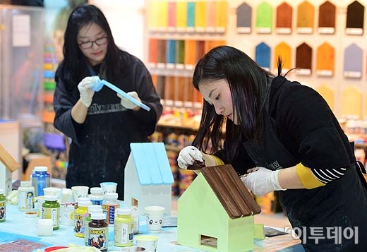 ‘2013 DIY&리폼 박람회’가 6일 오전 서울 강남구 삼성동 코엑스에서 열린 가운데 박람회를 찾은 관람객들이 DIY 소품 만들기를 하고 있다. 오는 9일까지 열리는 DIY&리폼 박람회는 작게쓰고 빌려쓰고 직접 만들어 사용하는 3대 신(新)소비문화 트랜드를 반영하여 알뜰소비문화 확산을 위해 기획되었다. 방인권기자 bink7119@
