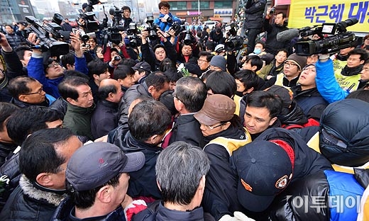 덕수궁 대한문 앞 쌍용자동차 해고노동자 천막 농성장 강제철거를 위한 행정대집행이 실시된 8일 오전 농성장 앞을 덕수궁 앞 쌍용차 농성장 강제철거를 막고 있던 금속노조 쌍용자동차 지부 조합원과 참가자들이 중구청 관계자들과 대치하고 있다. 방인권기자 bink7119@