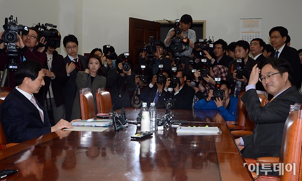 오늘 8일부터 시작되는 3월 임시국회는 여야가 합의점을 찾지 못해 난항을 겪고 있다. 이날 오후 김기현 새누리당 원내수석부대표(왼쪽)와 우원식 민주통합당 원내수석부대표가 국회 운영위 소회의실에서 해결책을 찾기 위한 회담을 가진 자리에서 서로 시선을 외면하고 있다. 노진환 기자 myfixer@
