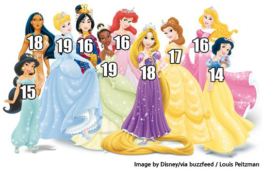 게시물에 따르면 백설공주가 14살로 가장 어리며, 어어 알라딘의 쟈스민이 15살, 잠자는 숲속의 공주 오로라가 16살로 적혀져있다. 신데렐라는 19살로 가장 나이가 많았다.
