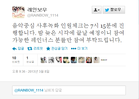 ‘걸그룹’ 레인보우의 트위터에는 “레인보우 재경양이 오늘 쇼음악중심 MC로 진행을 맡았습니다. 레인너스 여러분 본방 사수 잊지 마세요. 본방송 현장에 참여하 여러분 2시30분까지 MBC드림센터 로비로 모여 주시길 바랍니다”라는 글을 남겨 있다.