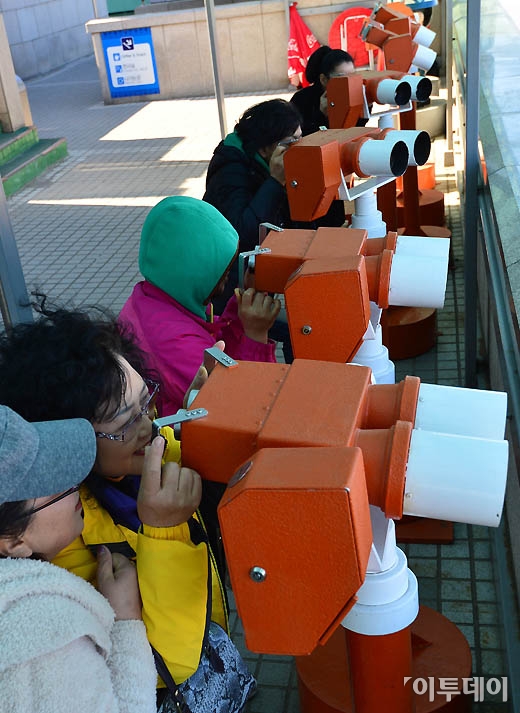 북한의 남북 불가침 합의 폐기 선언으로 한반도 군사 긴장이 최고조에 이른 가운데 10일 경기도 파주시 오두산 통일전망대를 찾은 관광객들이 망원경으로 북한 지역을 살펴보고 있다.