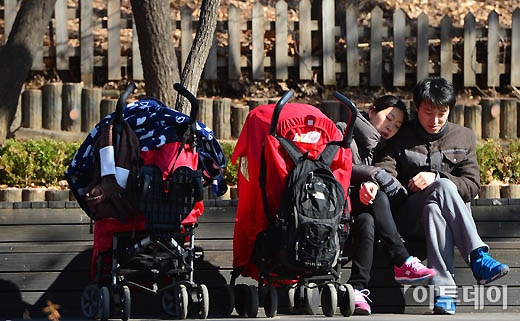 10일 서울 능동 어린이대공원을 찾은 한 가족이 봄볕을 만끽하며 휴식을 즐기고 있다.