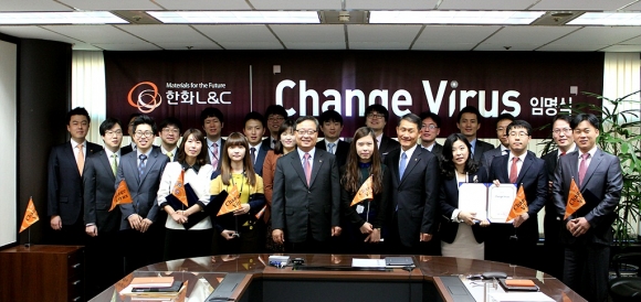 ▲한화L&C 김창범 대표(앞줄 왼쪽에서 다섯번째)가 체인지 바이러스 4기 임명식 후 기념촬영하고 있다.