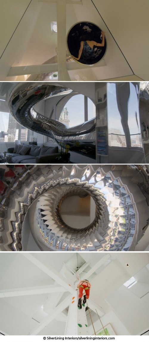 이 아파트의 전체 높이는 약 12m. 거울처럼 반짝이는 스테인리스 재질의 4층 미끄럼대가 설치돼 있다. 4층 미끄럼대는 침실에서 거실로, 출입문으로 미끄러지듯이 이동할 수 있다는 것이 특징이다. 24m 길이의 미끄럼대와는 별도로 설치된 철골 구조물은 실내 등반 시설로 재활용되고 있다.