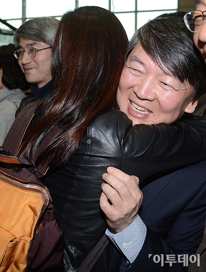 11일 오후 대선 후 미국 샌프란시스코에서 머물러 온 안철수 전 서울대 교수가 인천공항을 통해 입국, 한 여성지지자와 포옹을 하고 있다.