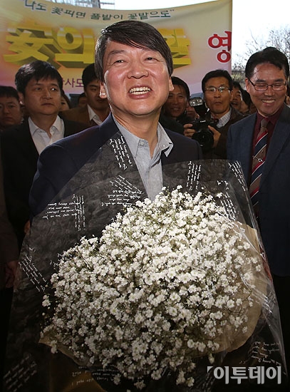 안철수 전 서울대 교수가 11일 미국 샌프란시스코로 떠난 지 82일 만에 인천공항을 통해 귀국, 4.24 재보궐선거 노원병 지역 출마 기자회견을 마친 뒤, 지지자에게 안개꽃다발을 받고 있다.