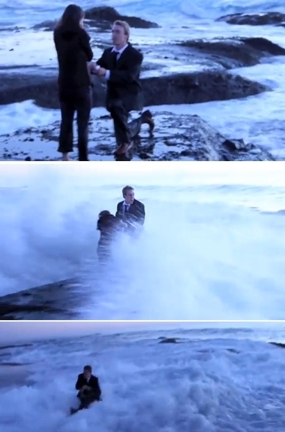 이들은 한 동안 파도에서 허우적거렸지만 다행히 안전한 곳으로 밀려와 다시 프로포즈를 이어갈 수 있었다.