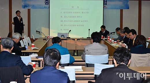 중소기업자주협동포럼이 12일 오전 서울 영등포구 중소기업중앙회에서 한국중소기업학회 및 중소기업중앙회 주최로 열린 가운데 이동주 IBK 경제연구소 연구소장이 중소기업금융의 현주소와 발전방향이란 주제로 강연하고 있다. 방인권기자 bink7119@