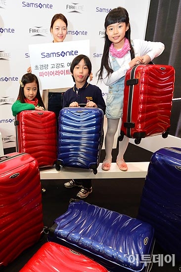 세계적인 라이프스타일 브랜드 쌤소나이트가 12일 오전 서울 롯데백화점 본점 앞에서 초경량 고강도 여행 가방 '파이어라이트'를 선보이고 있다. 이번에 출시된 신제품 '파이어라이트'는 신소재인 커브소재를 활용해 혁신적으로 무게를 줄이고 외형의 변화에도 깨지거나 변형되지 않는 뛰어난 원상회복능력이 특징이다. 방인권기자 bink7119@