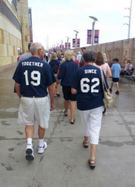 이 '연륜이 묻어난 커플룩' 속 남성은 TOGETHER 19가 써 있는, 여성은 SINCE 62가 적혀있는 티셔츠를 입고 있다. 두 사람의 등에있는 문구를 합치면 'TOGETHER SINCE 1962' 즉, '우리 1962년부터 함께했어요'라는 의미가 된다. 올해가 2013년이니 만약 두 부부가 지금까지 함께하고 있다면 50년이 넘게 함께 해온 '장수커플'인 셈이다.