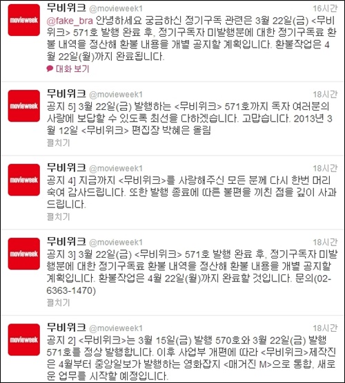 무비위크는 12일 공식 트위터를 통해 "오는 22일 571호 발행을 끝으로 발행을 종료한다"면서 폐간 소식을 알렸다. 무비위크 측은 "지금까지 '무비위크'를 사랑해주신 모든 분께 다시 한번 머리 숙여 감사드립니다. 또한 발행 종료에 따른 불편을 끼친 점을 깊이 사과드립니다"라고 인사도 전했다.