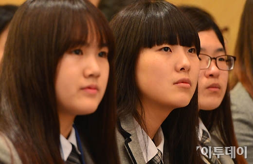'高! to the 우리채용설명회'가 13일 서울 중구 우리은행 본점에서 열린 가운데 행사에 참석한 학생들이 사회자의 말을 경청하고 있다.