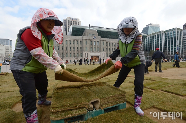 겨울철 스케이트장으로 활용되던 서울광장이 새옷으로 갈아입고 시민에게 개방된다. 14일 오전 서울시 관계자들이 시청 앞 서울광장에 잔디를 옮겨 심고 있다. 노진환 기자 myfixer@
