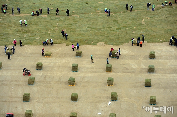 겨울철 스케이트장으로 활용되던 서울광장이 새옷으로 갈아입고 시민에게 개방된다. 14일 오전 서울시 관계자들이 시청 앞 서울광장에 잔디를 옮겨 심고 있다. 노진환 기자 myfixer@