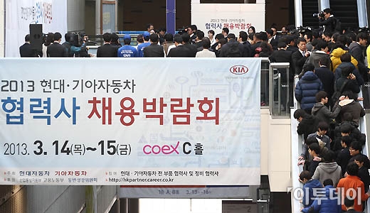 '2013 현대·기아자동차 협력사 채용박람회'가 14일 서울 삼성동 코엑스에서 열렸다. 많은 구직자 및 관계자들이 행사장에 몰려 있다.