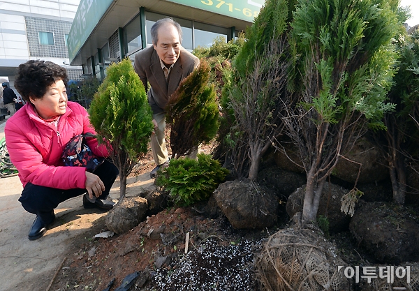 차츰 예년기온을 회복하며 따스한 봄날씨를 보이고 있는 14일 오후 양재동 화훼공판장 묘목시장을 찾은 시민들이 나무를 살펴보고 있다. 노진환 기자 myfixer@