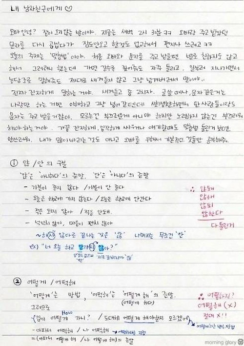 편지에서는 "오늘의 주제는 '맞춤법'"이라며 "처음 오빠와 문자를 주고 받을 땐 별로 친하지도 않고 해서 그러려니 했는데 가면 갈수록 짚어줘도 자꾸 틀리고, 일부러 지나가면서 농담조로 말해줘도 제대로 새겨듣지 않고 그냥 넘겨버린다"고 꼬집었다.