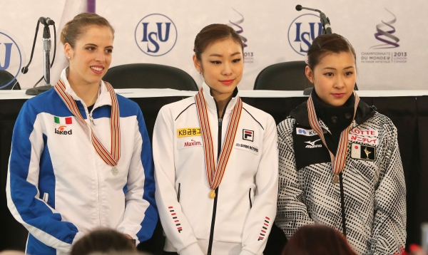 김연아가 15일(한국시각) 2013 국제빙상경기연맹(ISU) 세계피겨선수권대회가 열린 캐나다 온타리오주 런던 버드와이저 가든스 기자회견장에서 쇼트 우승메달을 받고 2위 이탈리아 카롤리나 코스트너(왼쪽), 3윌 일본 가나코 무라카미(오른쪽)와 기념사진을 촬영하고 있다.