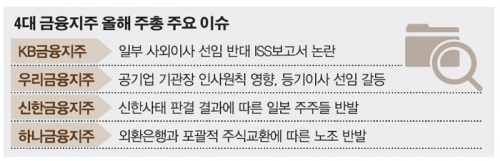 15일 금융권에 따르면 올해 4대 금융지주 주총의 최대 관심사는 박근혜 정부가 밝힌‘국정철학 공유’인사 선임 방침과 사외이사 연임 문제 등이다. 또 신한사태 후유증과 하나금융과 외환은행의 포괄적 주식교환에 따른 노조 반발 등이 주요 관전 포인트다.