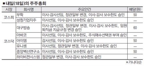 오는 18일에는 무학, 성창기업지주 코스피 2개사와 대구방송, 유니셈 등 코스닥 6개사를 더해 총 8개 회사가 주주총회를 개최한다.