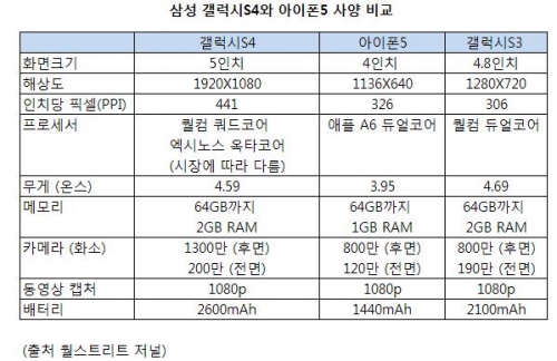 월스트리트저널(WSJ)은 이날 베일을 벗은 갤럭시S4와 애플의 아이폰5를 비교 분석했다.
