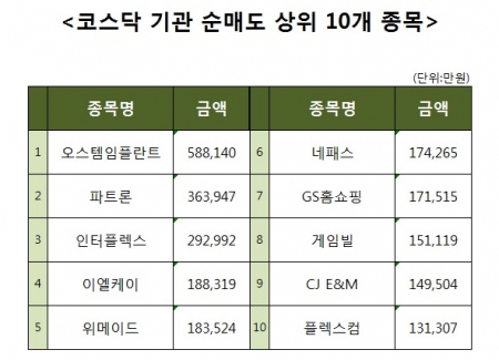 [코스닥 기관 순매도 상위 10개 종목]