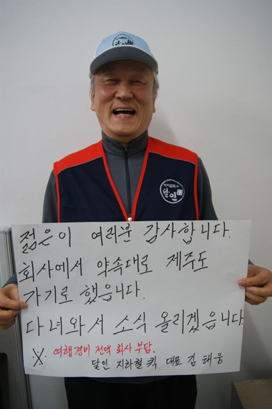 여행을 다녀올 수 있게 된 배 할아버지는 13일 페이스북에 "젊은이 여러분 감사합니다. 회사에서 약속대로 제주도 가기로 했습니다"라는 글이 적힌 종이를 들고 사진을 찍어올리며 고마움을 표현했다.
