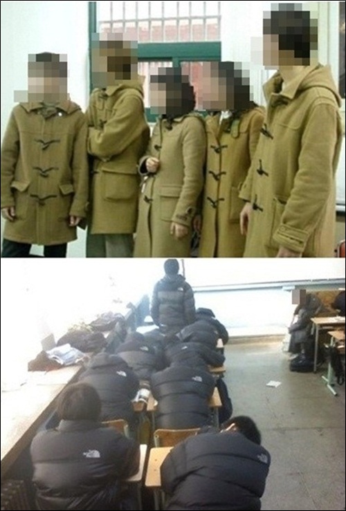 아래에는 현재 학생들의 유니폼이라고 할 수 있는 한 아웃도어 브랜드의 패딩점퍼를 입은 학생들의 모습이 담겨 있다.