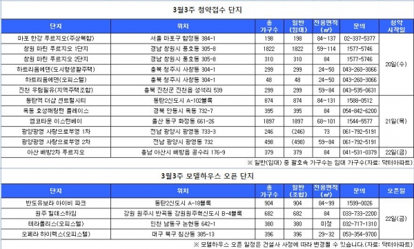 3월 셋째 주 모델하우스는 총 4곳이 문을 열 예정이다. 동탄 반도유보라 아이비 파크, 원주 힐데스하임 등이 모델하우스 오픈을 준비하고 있다.