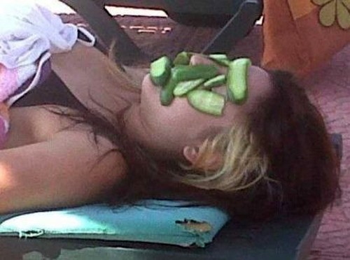 사진 속에는 오이마사지를 받고 있는 한 여성이 보인다. 하지만 왠지 웃음을 참을 수 없다. 여성의 얼굴 위에 올려진 오이가 마사지에는 어울리지 않을 정도로 두껍게 썰린 모양이기 때문이다. 대부분 오이 마사지에는 얇게 썬 오이가 사용된다.
